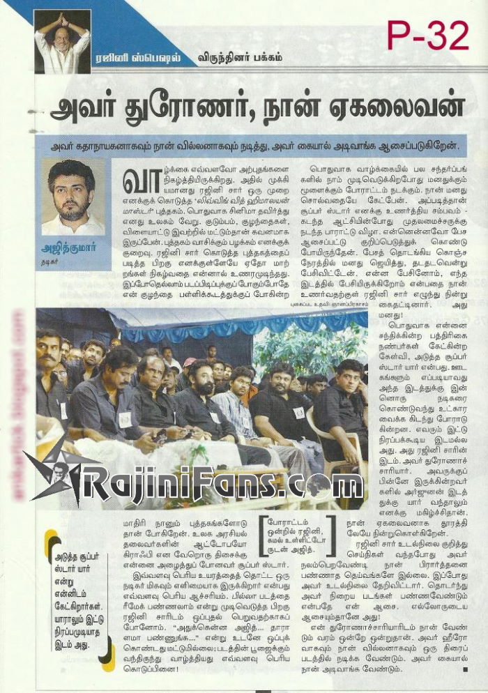 Rajinifans.com என்றதும் கையை ஒருகணம் இறுகப் பற்றியவர், "ஒரு அஞ்சு நிமிஷம் இருங்க பாஸ்" என்று கூறிவிட்டு, வந்திருந்தவர்களுடன் அவசர அவசரமாகப் போட்டோ செஷன் முடித்துவிட்டு வந்தார். நமக்காக அஜீத் ஒதுக்கியது 10 நிமிடங்கள். அதில் ஒன்பதரை நிமிடங்கள் அவர் பேசியது தலைவர் ரஜினியைப் பற்றி!