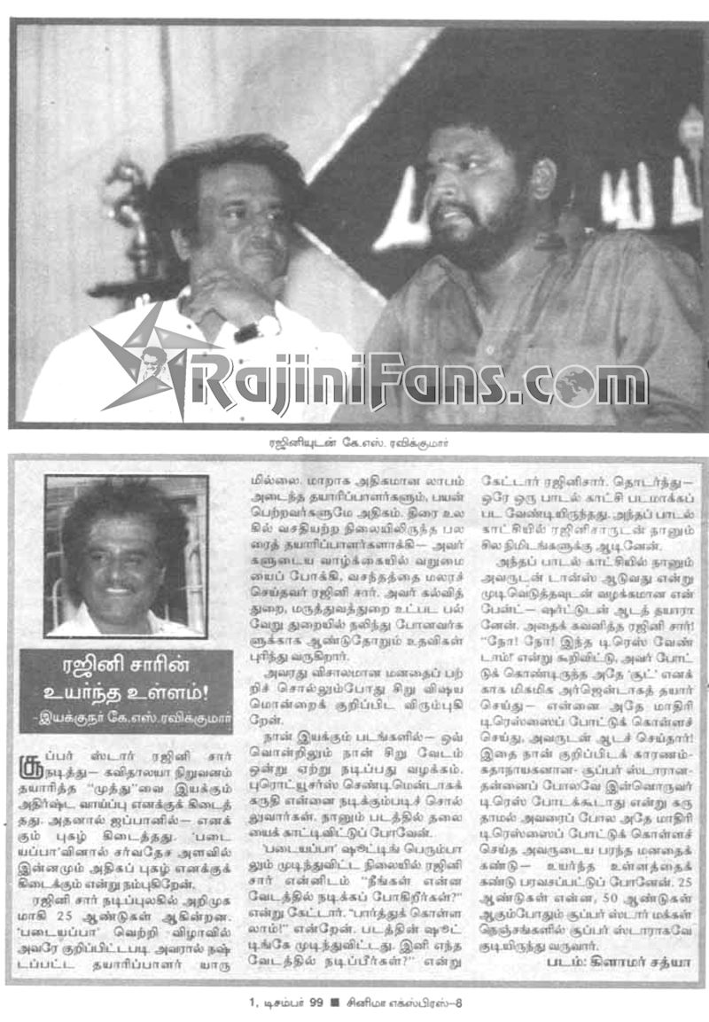 ரஜினியின் மிகப்பெரிய வெற்றிப்படங்களான "முத்து'', "படையப்பா'' ஆகியவற்றை டைரக்ட் செய்த ரவிக்குமார் "படையப்பா'' தயாரிப்பின்போது ஏற்பட்ட அனுபவங்கள் பற்றி கூறியதாவது:-