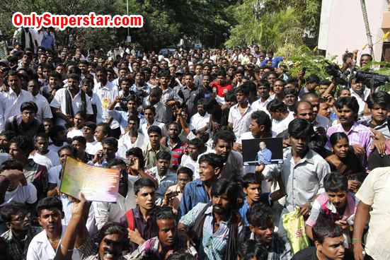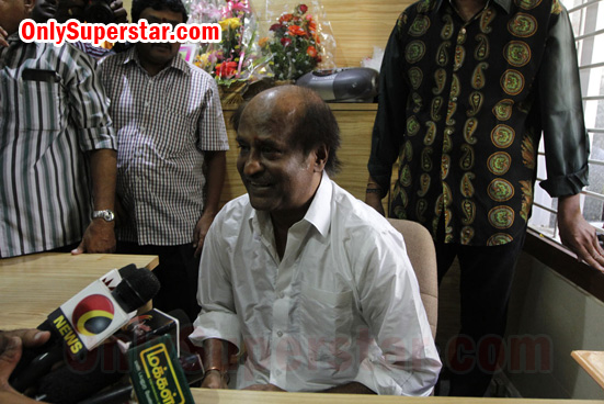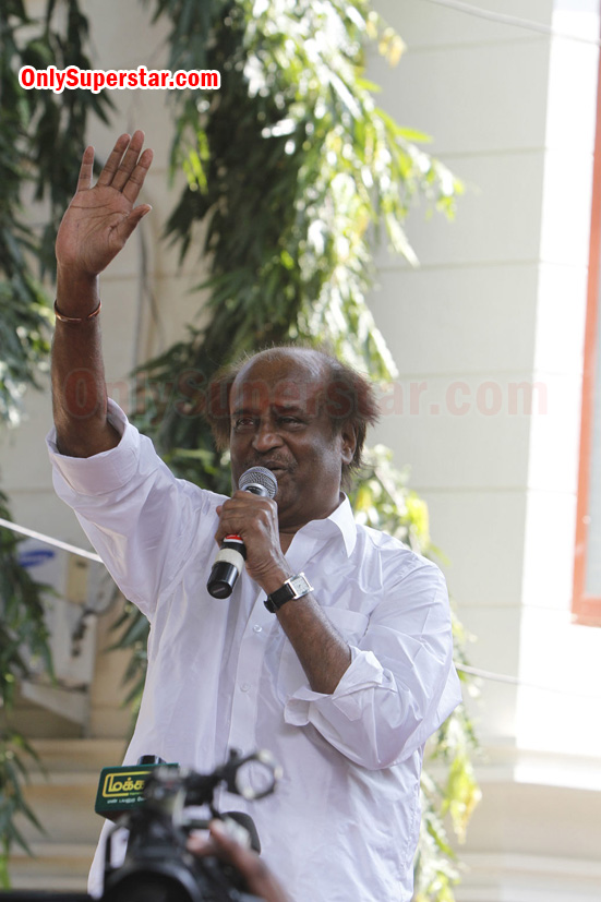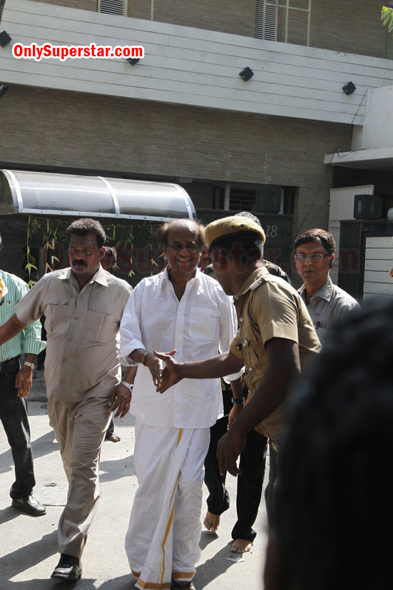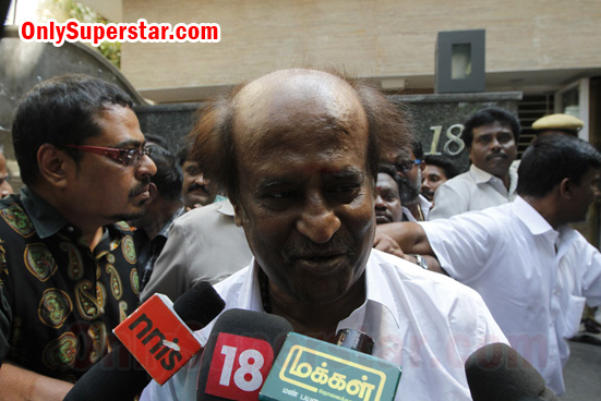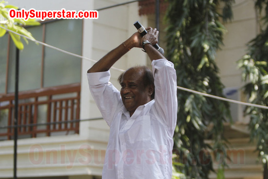 இதையடுத்து இன்று அதிகாலையிலேயே ரசிகர்கள் ரஜினி வீட்டில் திரண்டார்கள். காலை 9 மணிக்கு ரஜினி வீட்டை விட்டு வெளியே வந்தார். கூடி நின்ற ரசிகர்கள் சூப்பர் ஸ்டார் வாழ்க. தலைவர் ரஜினி வாழ்க என கோஷம் எழுப்பினர். ரஜினி வெள்ளை நிறத்தில் சாதாரண வேட்டி- சட்டை அணிந்து இருந்தார். ரசிகர்களைப் பார்த்து உற்சாகமாக கையசைத்து கும்பிட்டார்.