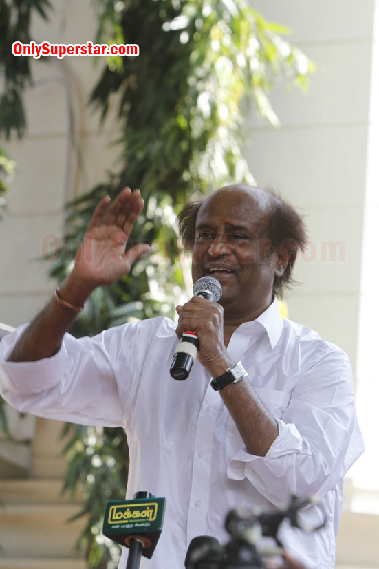 ரசிகர்கள் சிலர் ரஜினி காலில் விழுந்து கும்பிட முயற்சித்தனர். அவர்களை காலில் விழக்கூடாது என்று சொல்லி தடுத்தார். ஐந்து நிமிடம் வீட்டுக்கு வெளியில் வாசலிலேயே நின்று ரசிகர்கள் வாழ்த்துக்களை பெற்றுக் கொண்டார். பின்னர் ரசிகர்கள் மத்தியில் மைக்கில் ரஜினி பேசியதாவது:-