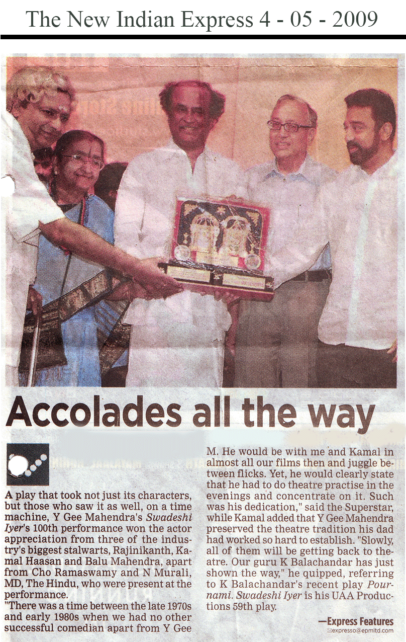 A play that took not just its characters, but those who saw it as well, on a time machine, Y Gee Mahendra's Swadeshi Iyer's 100th performance won the actor appreciation from three of the industry's biggest stalwarts, Rajinikanth, Kamal Haasan and Balu Mahendra, apart from Cho Ramaswamy and N Murali, MD, The Hindu, who were present at the performance.