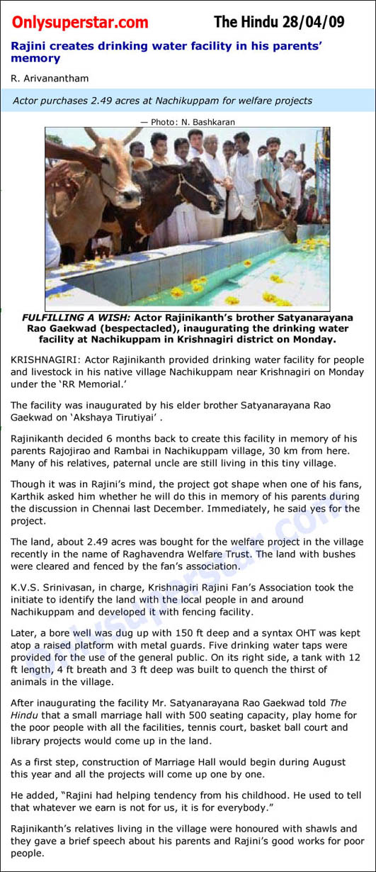 Hi All!!Thanks vijay R The one only super star in the world that is our thalaivarr..This is a lesson to everybody. Rajini always wish that his fans should take care their parents and family first. He is a such a person who do like this. Let us do this and add power to Rajini words. Cheers......ungal abhimanni velan...