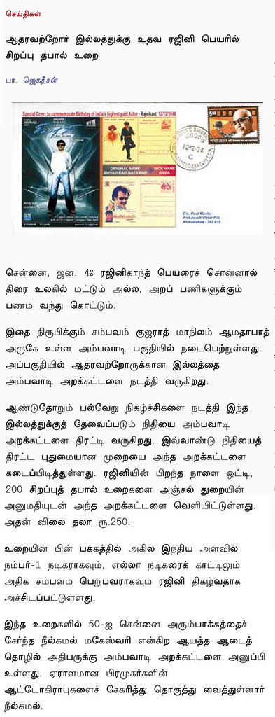 Yes our superstar Rajnikanth has made it to the postal cover too. A charity trust in Ahmedabad in Gujarat has come up with a novel idea to raise funds for their charity work. On occasion of Rajni's birthday, 200 special postal covers were released with proper permissions from the postal department. These postal covers had stills of Rajnikanth in the backside and also had the following line stamped on it: