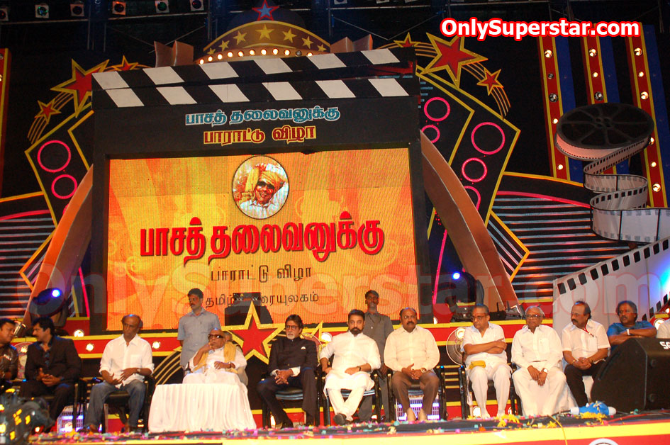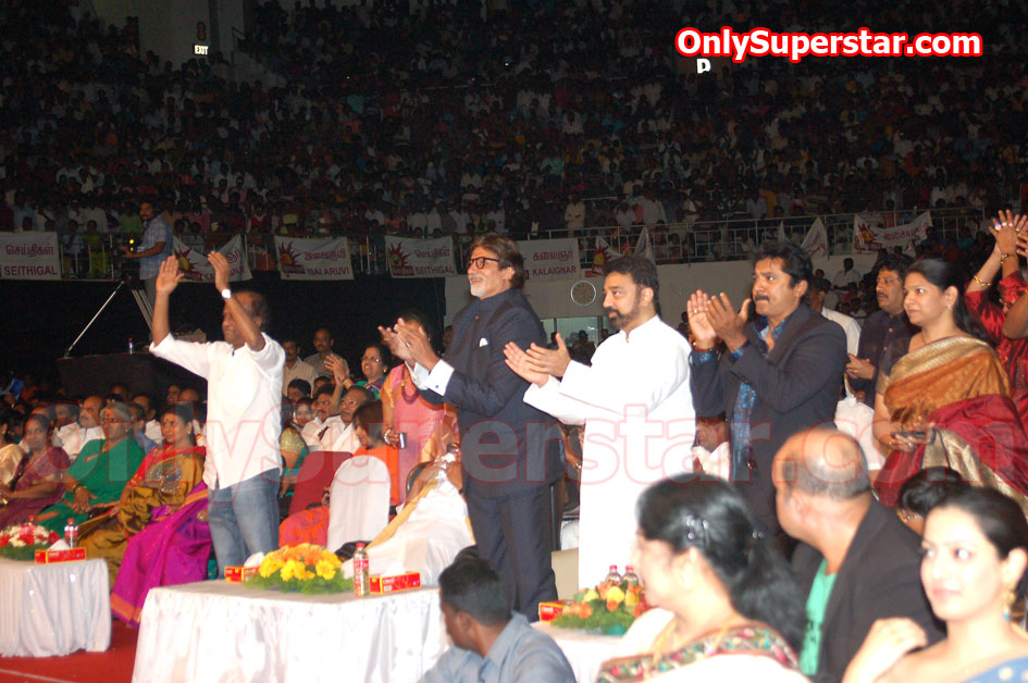 முன்னதாக கலைநிகழ்ச்சிகள் நடைபெறும்பொழுது முதல்வர் இயற்க்கை உபாதையை கழிக்க வெளியே செல்ல நேர்ந்தது. முதல்வர் இருக்கையைவிட்டு எழுந்திருக்க, சூப்பர் ஸ்டாரும் எழுந்துவிட்டார். அமிதாப்பும் முதல்வருடன் சென்றுவிட, கமலுடன் சிறிது நேரம் பேசிக்கொண்டிருந்தார்.