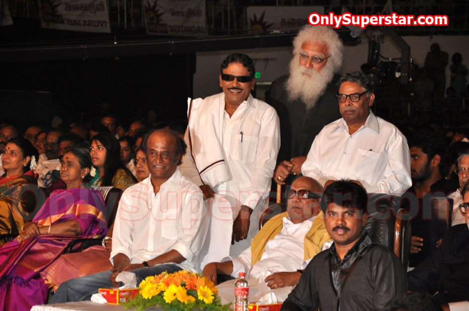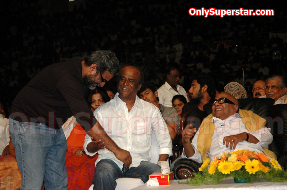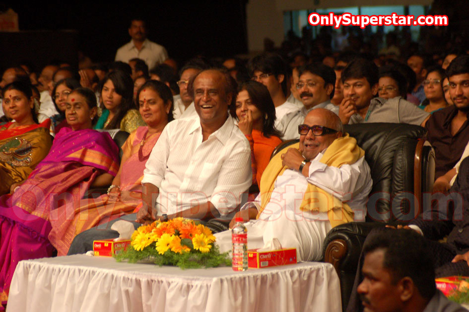 மேடையில் முதல்வருக்கு அடுத்த இருக்கை சூப்பர் ஸ்டாருக்காக போடப்பட்டது. (கலைஞர் கிட்டே எனக்கு பிடிச்ச விஷயத்துல இதுவும் ஒன்னு. தாம் கலந்துகொள்ளும் பொது நிகழ்சிகளில் சூப்பர் ஸ்டாரும் கலந்துகொள்ள நேர்ந்தால், சூப்பர் ஸ்டார் தன் பக்கத்தில் அமருமாறு பார்த்துக் கொள்வார். சூப்பர் ஸ்டாருக்கு இந்த சிறப்பு முக்கியத்துவத்தை அளிக்க அவர் என்றுமே தயங்கியதேயில்லை. இந்த நிகழ்ச்சியை பொறுத்தவரை கீழேயும் சரி மேடையிலும் சரி, முதல்வருக்கு அருகில் தான் ரஜினி அமரவைக்கப்பட்டார்.)