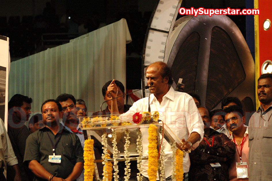 திடீரென்று அரங்கில் பலத்த பரப்பரப்பு… கைதட்டலும் விசில் சத்தமும் பறக்க… புரிந்துவிட்டது தலைவர் வந்துவிட்டார் என்று. செக்யூரிட்டிகள் புடைசூழ சிங்கமென நடந்து வந்தார் தலைவர். (தலைவர் படத்தோட அறிமுக சீனை பார்த்த திருப்தி எங்களுக்கு!) வந்தவர் நேரே முதல்வரை நோக்கி சென்று அவருக்கு வணக்கம் சொன்னார். தாமதத்திற்கு வருத்தம் தெரிவித்தார். அருகிலிருந்த அமிதாப் மற்றும் கமல் ஆகியோருக்கும் வணக்கம் சொல்லிவிட்டு தனது சீட்டில் உட்கார்ந்தார்.