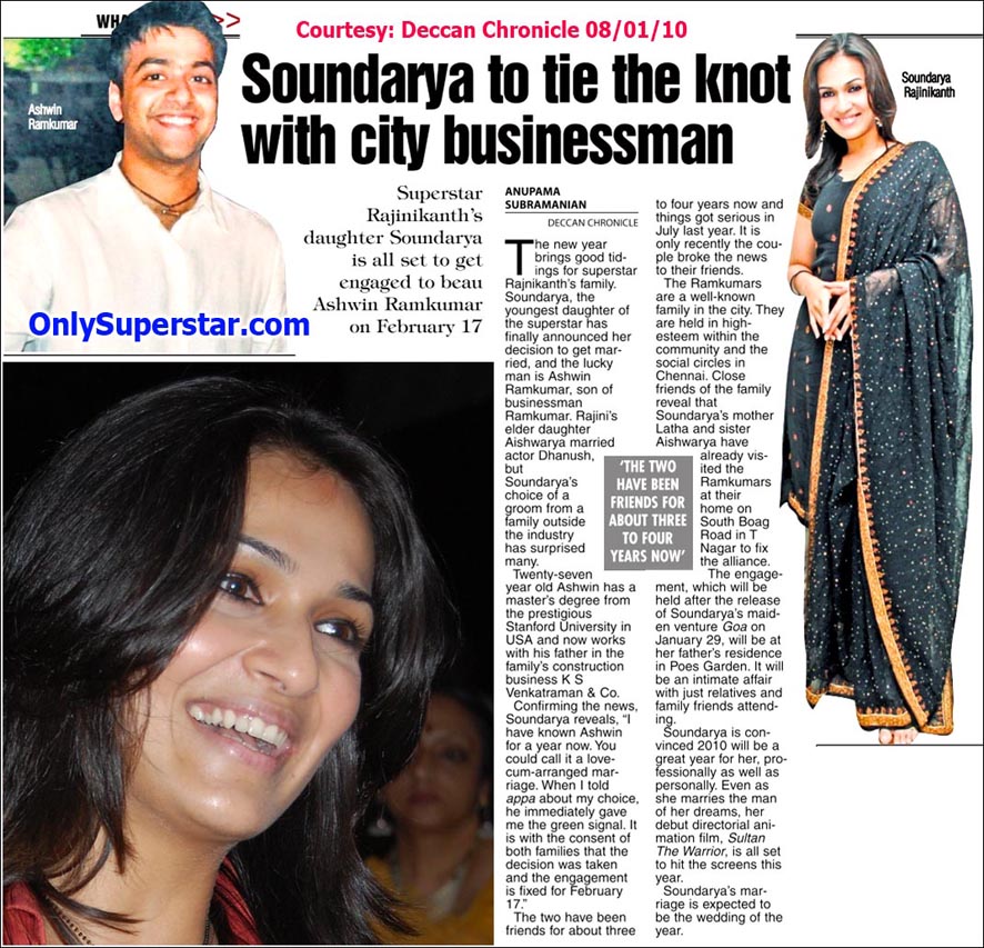 சூப்பர் ஸ்டார் ரஜினியின் இளைய மகள் செல்வி.சௌந்தர்யாவின் திருமண நிச்சயதார்த்தம் சென்னை பார்க் ஷெராட்டன் ஓட்டலில் புதன் மாலை நடைபெற்றது.