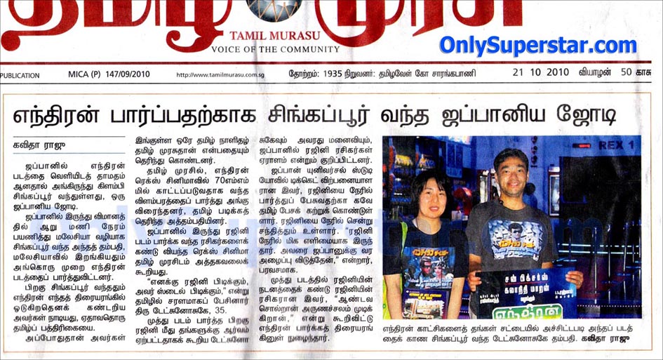இது போல, எந்திரனை பார்ப்பதற்காக ஜப்பானிலிருந்து விமானத்தில் சுமார் ஏழுமணி நேரம் பயணம் செய்து (5240 கி.மீ தூரம் - சுமார் ஏழு மணி நேரம் விமானப் பயணம்) சிங்கபூருக்கு வந்த ஒரு ஜப்பானிய ஜோடி பற்றி சிங்கப்பூரில் வெளியாகும் ‘தமிழ் முரசு’ நாளிதழில் செய்தி வெளியாகியுள்ளது. அதுவும் முதல் பக்கத்தில் பிரதானமாக.