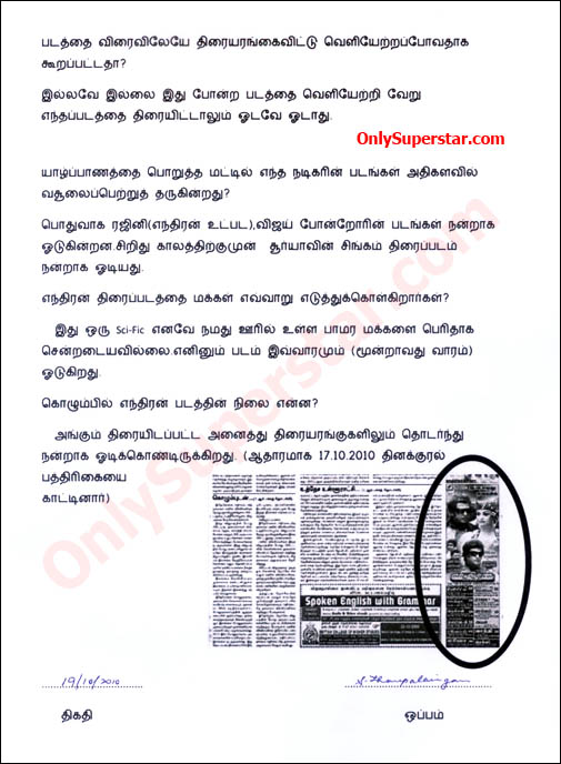 மேலும் தினக்குரல் பத்திரிகையில் எந்திரன் திரைப்படம் இலங்கையில் வெளியிடப்பட்ட அனைத்து திரையரங்குகளிலும் தொடர்ந்தும் ஓடிக்கொண்டிருப்பதை நிருபிக்கும் முகமான 17.10.2010 ,18.10.2010 நாழிதள்களின் விளம்பரத்தையும் இணைத்துள்ளேன். மேலும் எனக்கு கிடைத்த ராஜா திரையரங்கில் எந்திரன் திரைப்படத்திற்கான கூட்டத்தினரது புகைப்படங்கள் சிலவற்றையும் அனுப்பியுள்ளேன்.