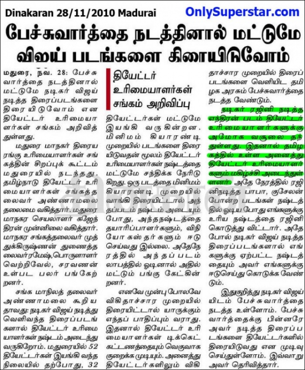 திரையரங்கு உரிமையாளர்கள் அவசர ஆலோசனை கூட்டம் மதுரையில் நேற்று முன்தினம் நடைபெற்றது. தங்களுக்கு தொடர்ந்து நஷ்டத்தை ஏற்படுத்தி வந்த ஒரு நடிகரின் படத்தை ரிலீஸ் செய்வது குறித்து நடந்த இந்த ஆலோசனைக் கூட்டத்தின் இறுதியில், மேற்படி நடிகர் நஷ்டத்தை ஈடு செய்யாவிட்டால் அவரது படத்தை ரிலீஸ் செய்யமாட்டோம் என்று அறிவித்துள்ளனர். மேலும், எந்திரனின் அமோக வசூலால் அனைவரும் மிகவும் மகிழ்ச்சியடைந்திருப்பதாகவும் கூறியிருக்கிறார்கள். அது தவிர, தனக்கு தொடர்பு இருக்கிறதோ இல்லையோ தனது படங்களால் நஷ்டம் ஏற்பட்ட போது அதை சூப்பர் ஸ்டார் ரஜினி ஈடு செய்ததையும் சுட்டிக்காட்டி பாராட்டியிருக்கின்றனர். திரையரங்கு உரிமையாளர்களின் நோக்கம் எதுவோ நமக்கு தெரியாது… ஆனால் எந்திரனின் வசூல் சாதனை பற்றிய ஒரு மிகப் பெரிய உண்மையை கூட்டத்தில் அறிவித்ததற்கு நம் நன்றி.