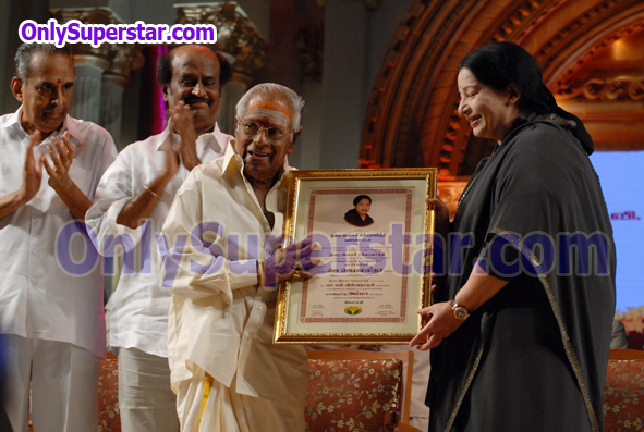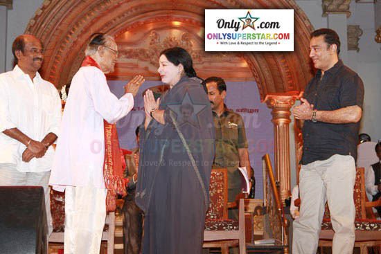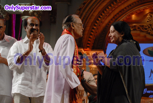 (கைத்தட்டல்… விசில்) “இந்த விழாவின் நாயகன் எம்.எஸ்.விஸ்வநாதன் – ராமமூர்த்தி சார் அவர்களே, இந்த விழாவிற்கும் தலைமை தாங்க வந்திருக்கும் தமிழக முதலமைச்சர் மாண்புமிகு புரட்சித் தலைவி அவர்களே, (கைத்தட்டல்… விசில்) இந்த மேடையில் அமர்ந்திருக்கும் என்னுடைய குருநாதர் கே.பி. சார் அவர்களே, சரவணன் சார் அவர்களே, இசைஞானி இளையராஜா அவர்களே (கைத்தட்டல்… விசில்), என்னுடைய நண்பன் கமல் ஹாசன் அவர்களே(கைத்தட்டல்… விசில்), இங்கே வருகை தந்திருக்கும் சோ சார் அவர்களே, சிவக்குமார் அவர்களே, மற்றும் திரையுலக சிறந்த பெரியவர்களே, அமைச்சர்களே, பத்திரிக்கை நண்பர்களே, என்னை வாழ வைக்கும் (பலத்த கைத்தட்டல்… விசில்), வாழ வைத்த தமிழக மக்களே (கைத்தட்டல்… விசில்) அனைவருக்கும் என் மனமார்ந்த நன்றியை தெரிவித்துக் கொள்கிறேன். (கைத்தட்டல்… விசில்)…..