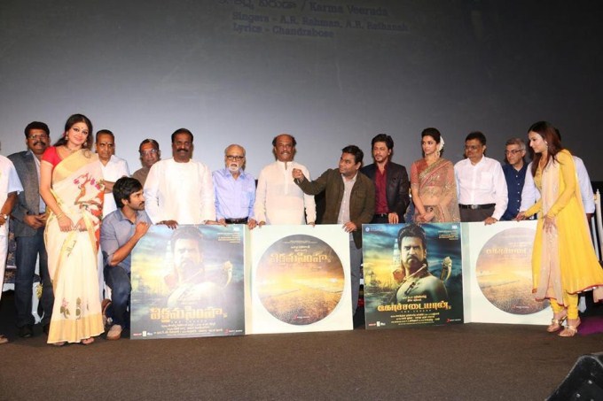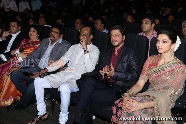 It was a star-studded event with Shah Rukh Khan, Deepika Padukone, Jackie Shroff participating along with directors K. Balachander, S.P. Muthuraman, K.S. Ravikumar, Soundarya Rajinikanth Ashwin and Shankar. Music director A. R. Rahman was also present in addition to the producers Murali Manohar and AVM Saravanan.