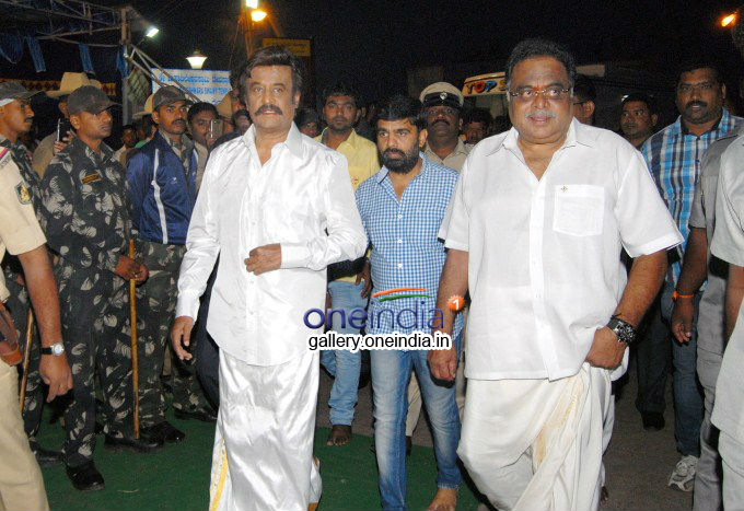 Clad in a white shirt and veshti, Rajini looked young and his hairstyle resembled the character he essayed in Sivaji. The twirly moustache gave him the aristocratic look, which was more than enough for his fans to exult over.