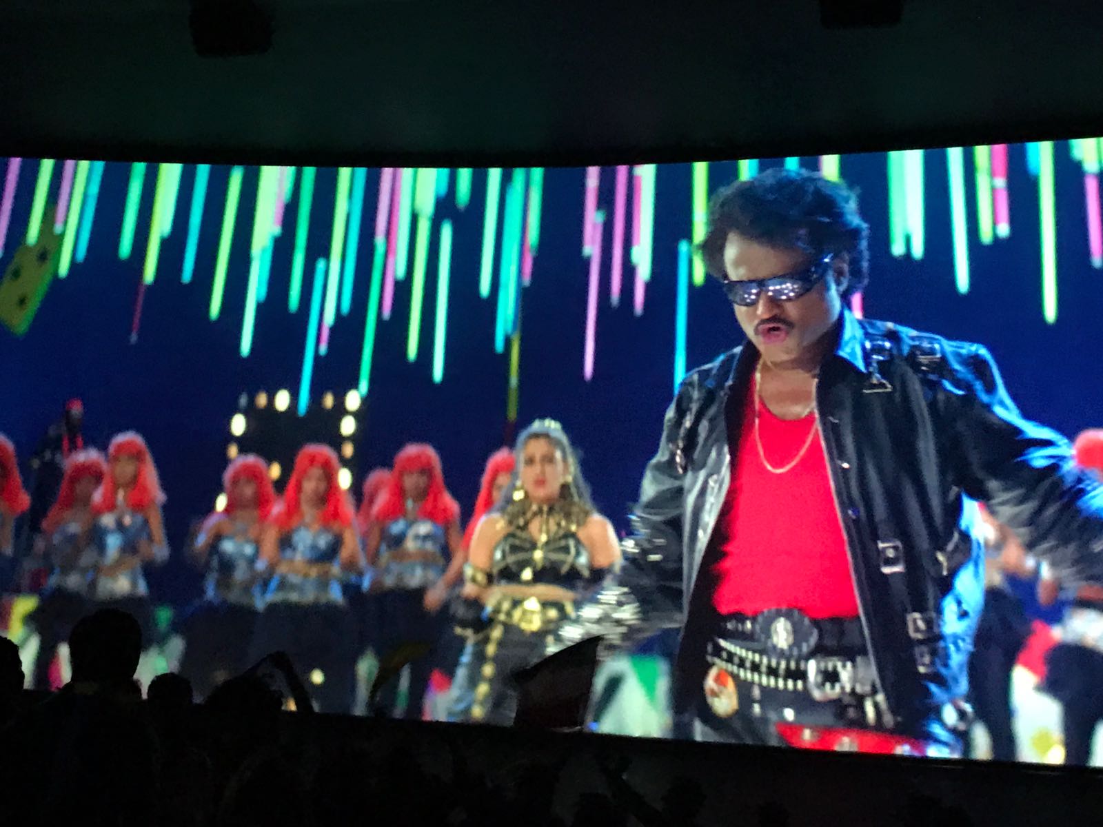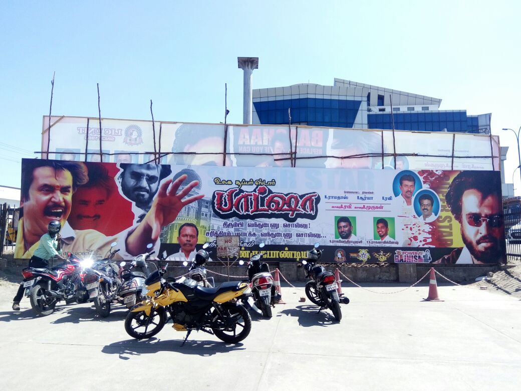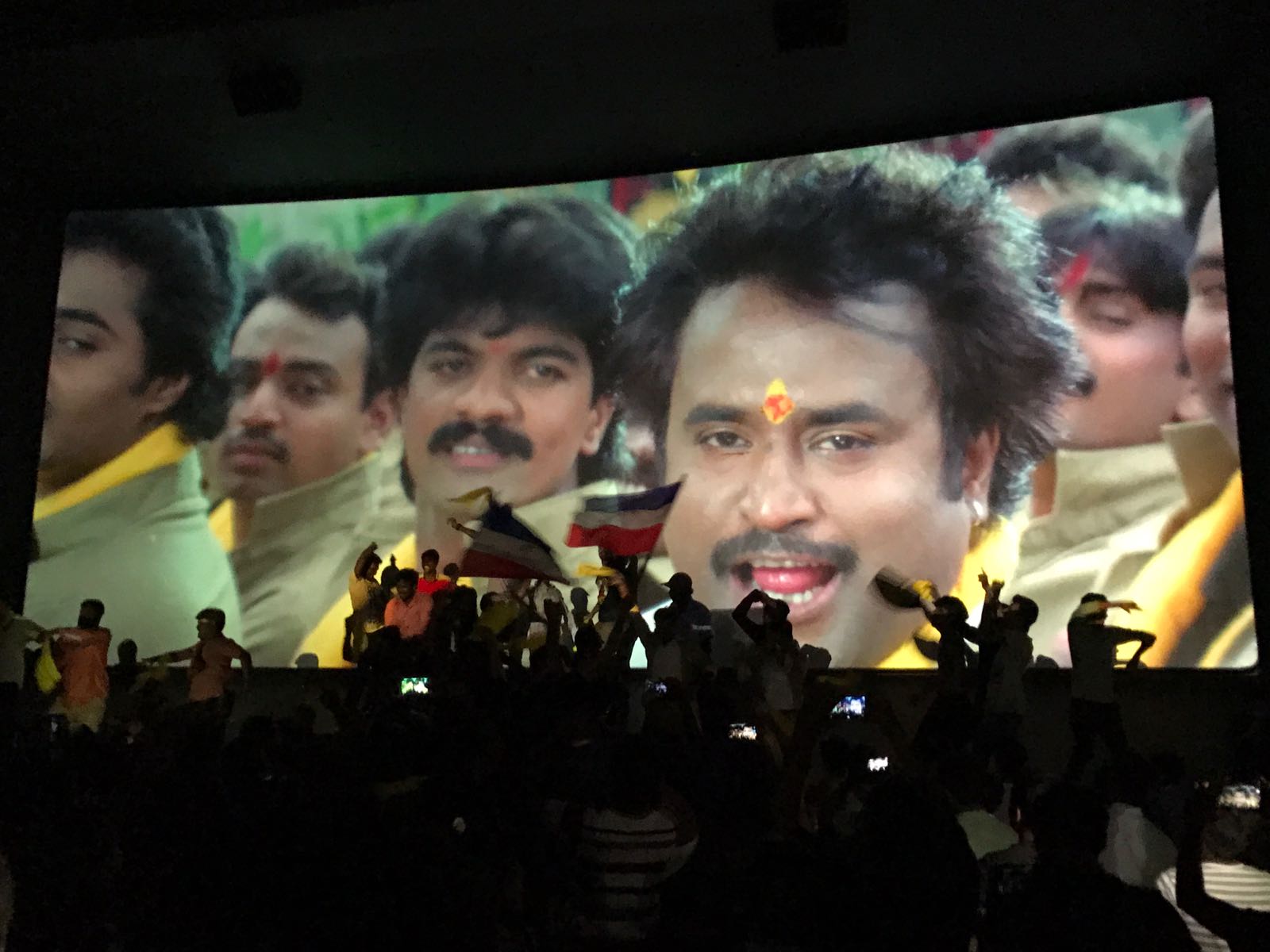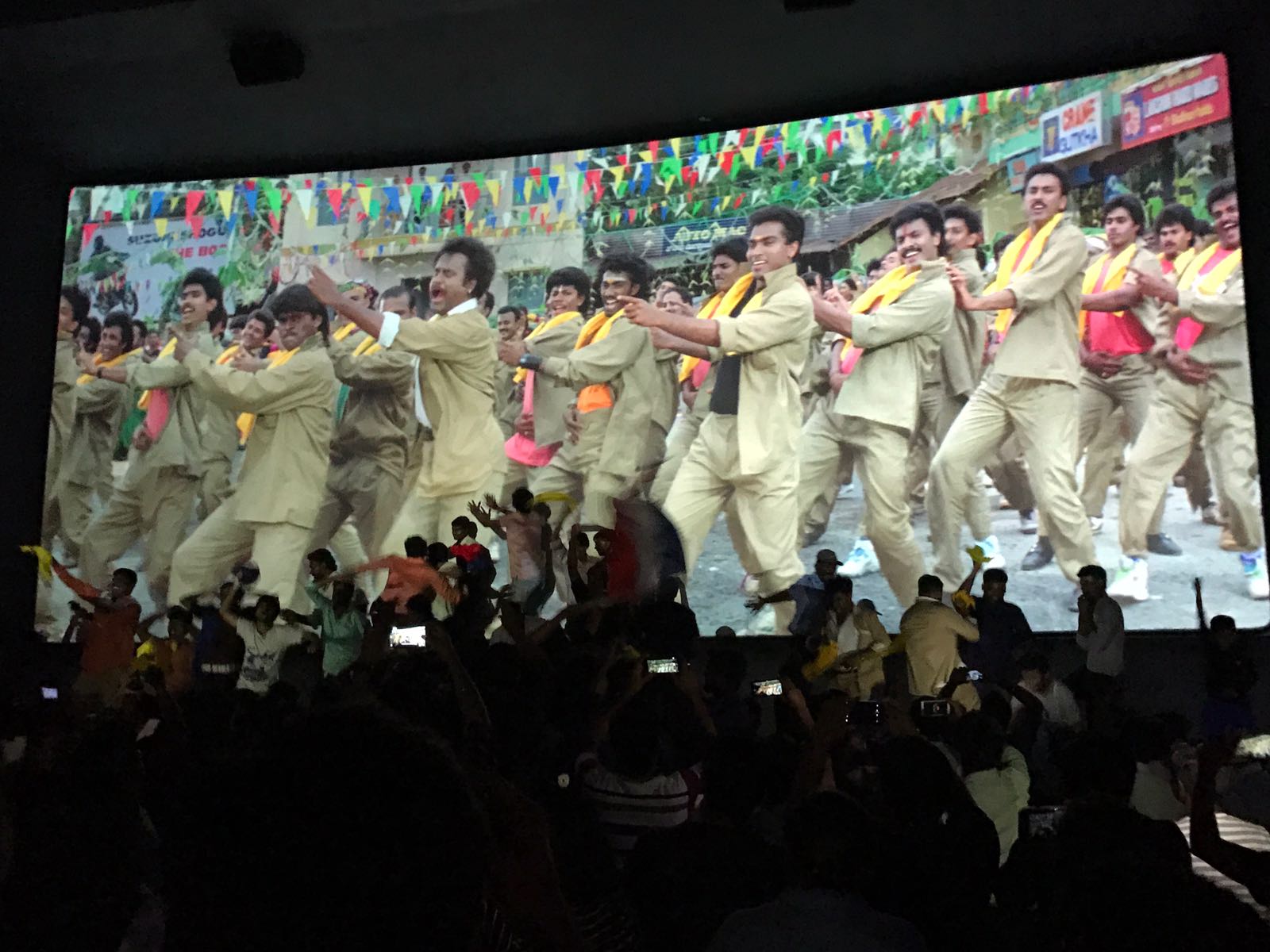 ஒவ்வொரு சீனும் போய்க்கொண்டிருந்த நேரத்தில் தலைவரின் என்ட்ரியை எதிர்பார்த்து உட்கார்ந்திருந்த சீட்டில் ஒரு இன்ச் தள்ளி உட்கார்ந்து ஸ்க்ரீனையே பார்த்துக் கொண்டிருந்தார்கள் ரசிகர்கள். சரியாக இந்த நேரத்தில் தலைவரின் காலைக் கண்ட ரசிகர்கள் தொண்டை கிழியும் அளவிற்குக் கத்தி எழுந்து ஆட ஆரம்பித்துவிட்டனர். ரஜினியின் தங்கைகள் இருவரும் பூசணிக்காயை ஆட்டோவைச் சுற்றி மேலே போட்டவுடன், அதை உடைப்பது தான் இன்ட்ரோ. நடக்க ஆரம்பித்த குழந்தை போல் ரசிகர்கள் திரையரங்கை அங்கும் இங்குமாக துள்ளிக் குதித்து வலம் வந்தனர். பாட்டுடன் சேர்த்து அங்கிருந்த அனைவரும் சேர்ந்து பாடத் தொடங்கினர்.