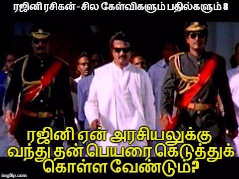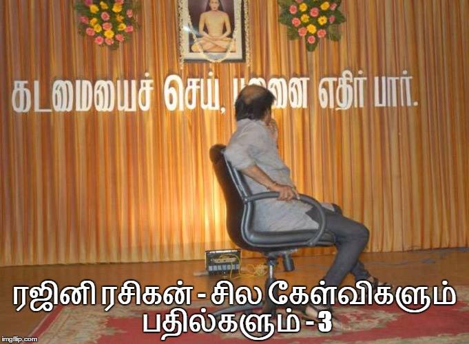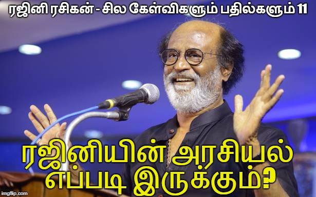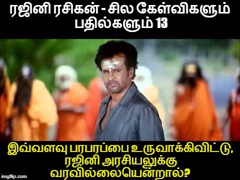 அப்புறம் "ரஜினி குழப்புகிறார்" "ஒரே பதிலையே கூறுகிறார்" என்று புலம்புவதில் அர்த்தமே இல்லை. நேரம் வரும் போது அவரே சொல்கிறேன் என்று சொல்லியிருக்கிறார். அவர் சொன்னதைச் செய்வார்.