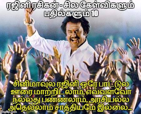 கே: கூடிய சீக்கிரம் அரசியலுக்கு வரும் எண்ணம் இல்லையென்றால் அரசியல் பற்றி ஏன் இப்போது பேசி ரசிகர்களை உசுப்பேற்ற வேண்டும்?