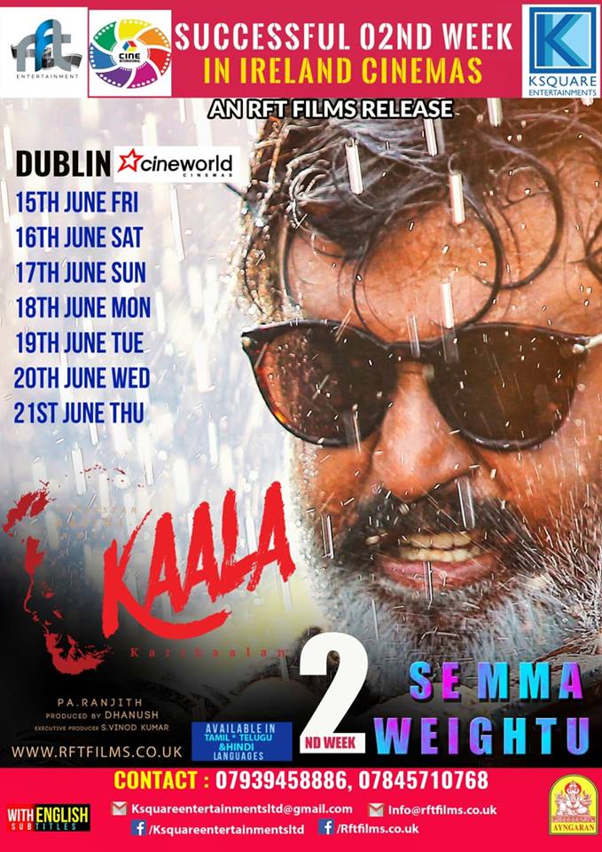 - தமிழர்கள் அதிகம் வாழும் ஐரோப்பிய நாடுகளிலும் காலாவின் வெற்றி உறுதிப்படுத்தப்பட்டுள்ளது. பிரான்ஸ், சுவிட்சர்லாந்து, அயர்லாந்து ஆகிய இடங்களில் தினசரி காட்சிகளாக வெற்றி நடை போட்டு வருகிறது.
