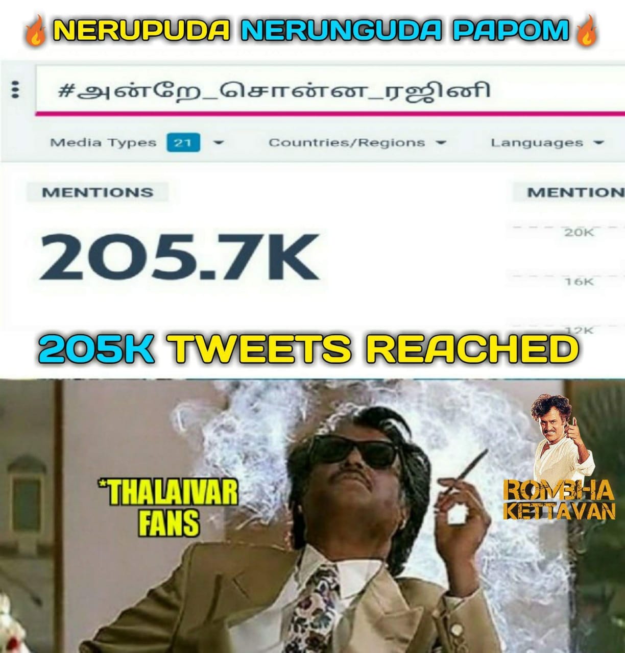 முன்பு ஒரு முறை காலாவதியான காலா, நான் தான் பா ரஜினி என்ற இரு டேக்களும் 50கே சொச்சம் ட்வீட்களுடன் ட்ரெண்டிங்கிள் வந்த போது முந்தி அடிந்து கொண்டு செய்தி வெளியிட்ட புதிய தலைமுறை எனும் நடுநிலை ஊடகம் இப்போது அன்றே சொன்ன ரஜினி 2 லட்சம் ட்வீட்களைக் கடந்த பின்பும் சாவகாசமாகச் செய்தி வெளியிட்டது..