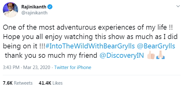 "Thank you very much dear Bear Grylls for an unforgettable experience ... Love you Discovery India. Thank you. #IntoTheWildWithBearGrylls."