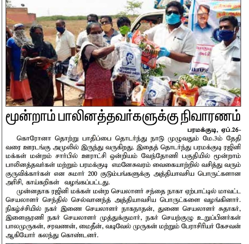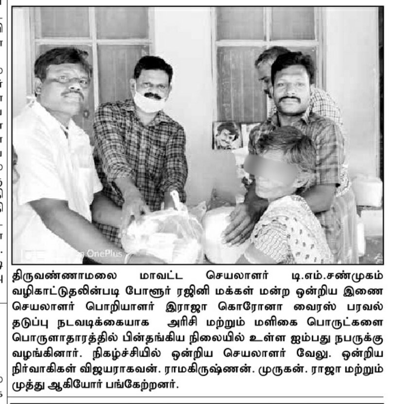 ரஜினி மக்கள் மன்ற நிர்வாகிகள் தமிழகமெங்கும் இந்த ஏப்ரல் மாதத்தில் எண்ணற்ற உதவிகளை செய்துள்ளனர் என்றும், தலைவர் ரஜினியின் மேற்பார்வை மற்றும் உத்தரவின் பேரில் இத்தனை சேவைகளும் பாதிக்கப்பட்ட மக்களின் துயர்களை துடைத்து வருகிறது என்றும் பதிவிட்டு வருகின்றனர். சாப்பாட்டுக்கு கஷ்டப்படும் ஏழைகளுக்கு ஓயாது உழைத்து அவர்களின் பசியை போக்கி வருகிறார்களாம்.