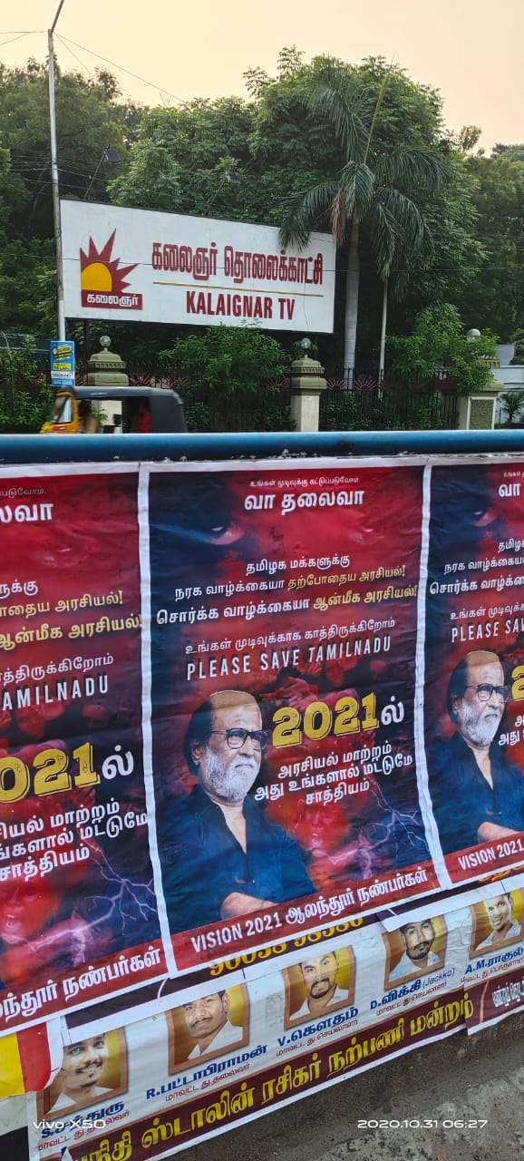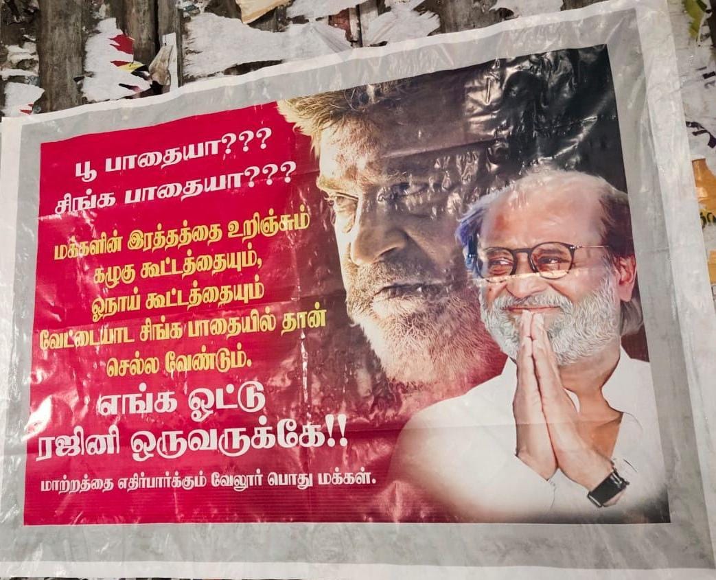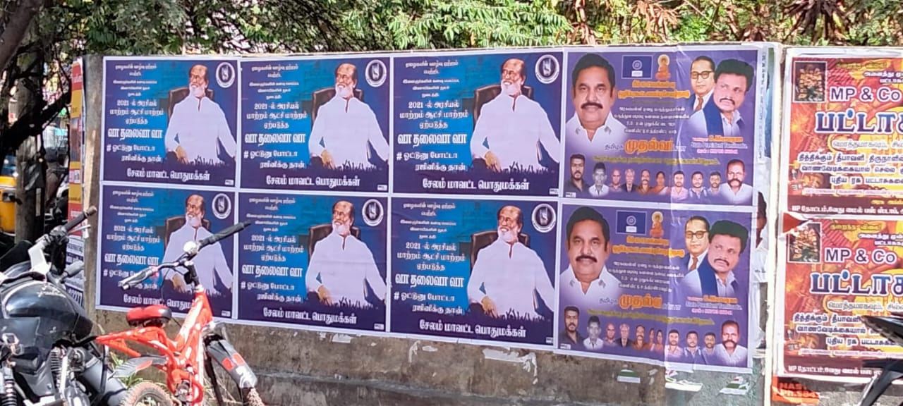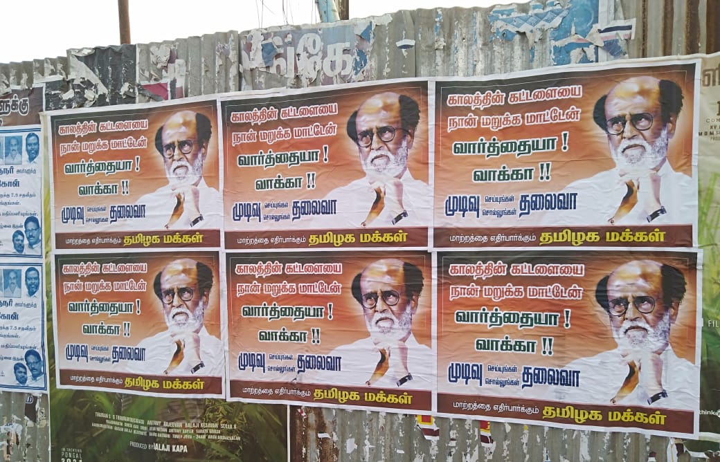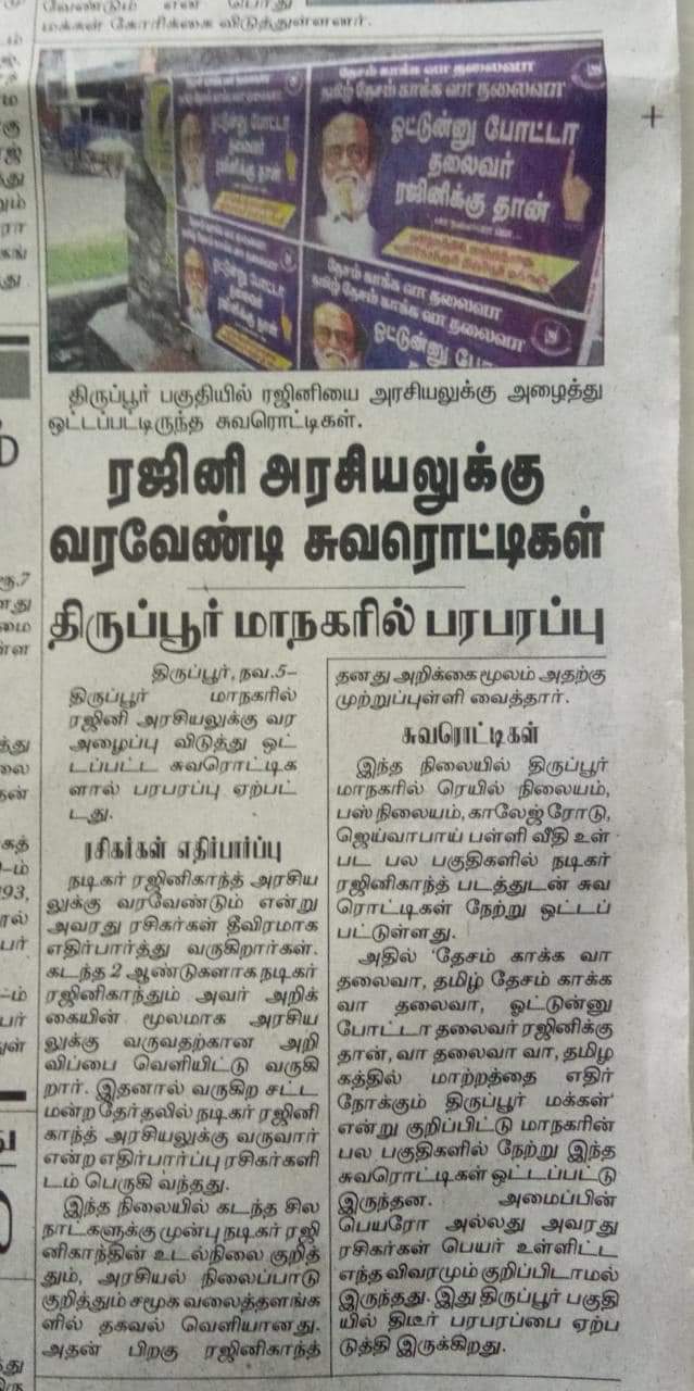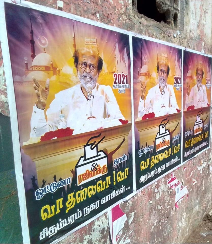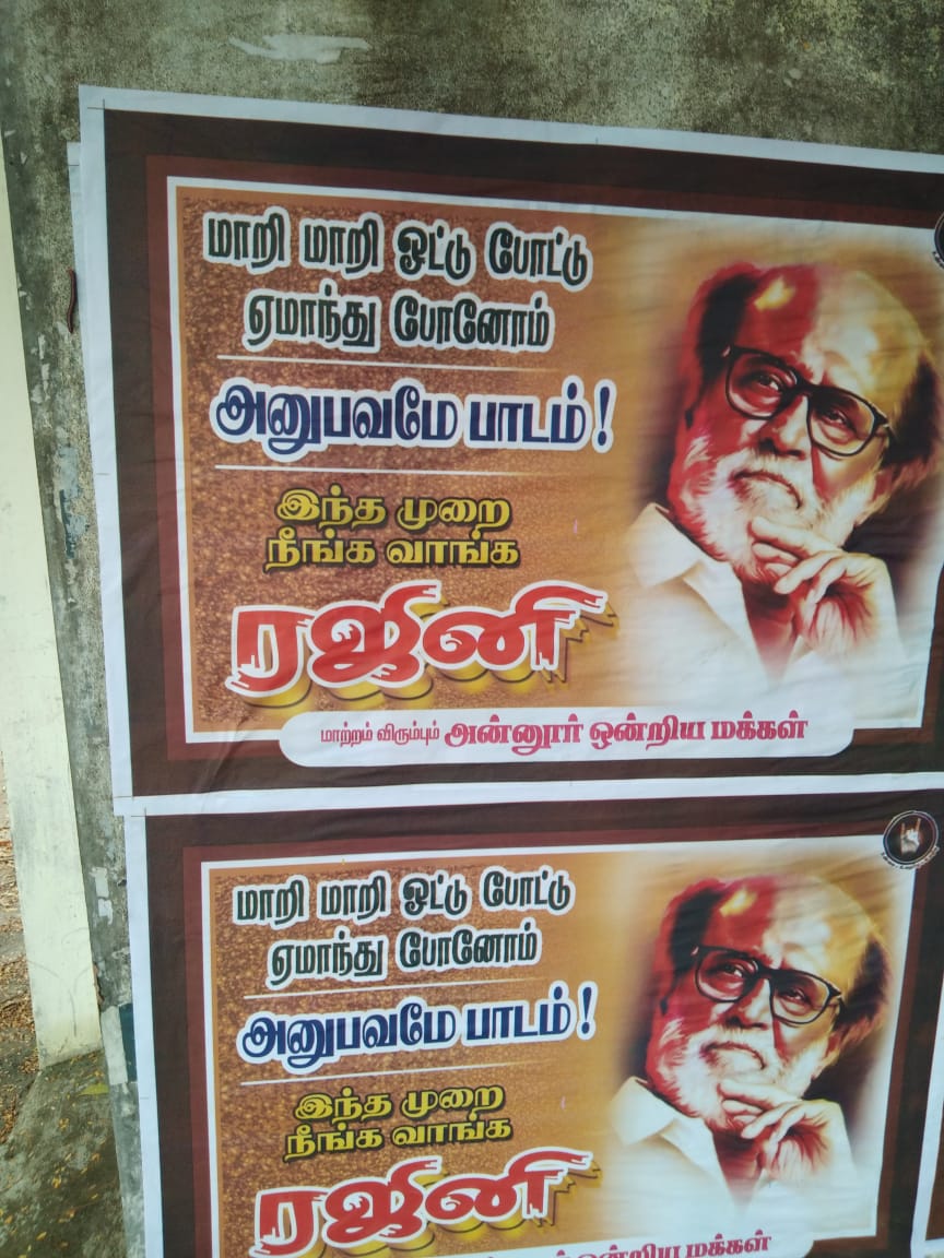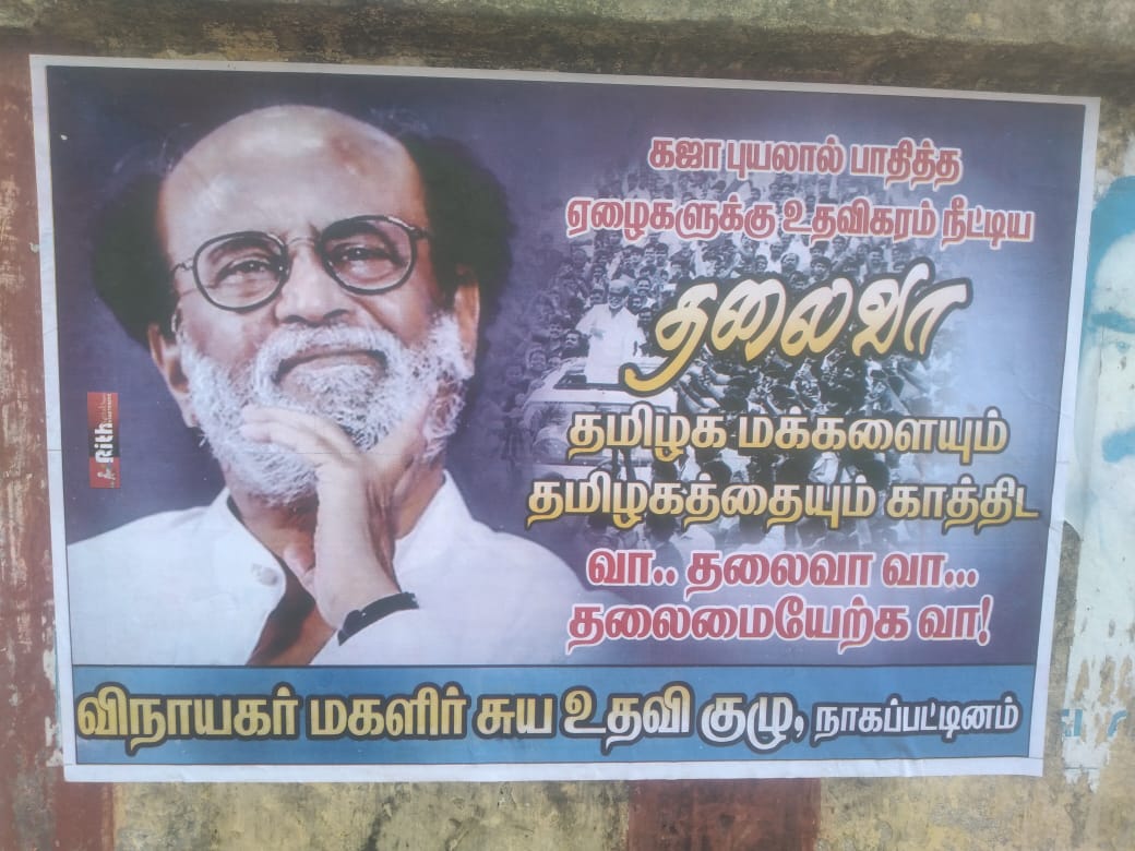 சில ரசிகர்கள் நடிகர் ரஜினிகாந்துக்கு ஆதரவாக சுவரொட்டிகளை வெளியிட்டு விரைவில் அரசியலுக்கு வருமாறு கேட்டு வருகின்றனர்.