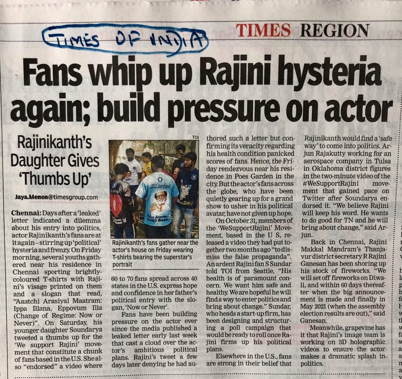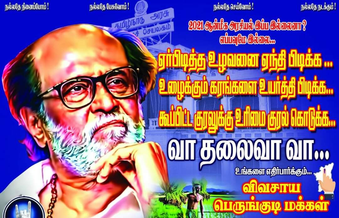 தமிழ்நாட்டின் வட மாவட்டங்களில் இருக்கும் ரஜினி ரசிகர் மன்றத் தலைவர் ஒருவர், இரண்டு ஆண்டுகளுக்கு முன்பு நடிகர் ரஜினிகாந்த் அரசியலுக்கு வரப்போவதாக உறுதியாக தெரிவித்தார், ஆனால் உடல்நிலை காரணமாக தற்போது அரசியலில் இணைய முடியாது என்று தெரிவித்துள்ளார், இது மாறும் என்று நாங்கள் நம்புகிறோம் என்று அவர் தெரிவித்துள்ளார்.