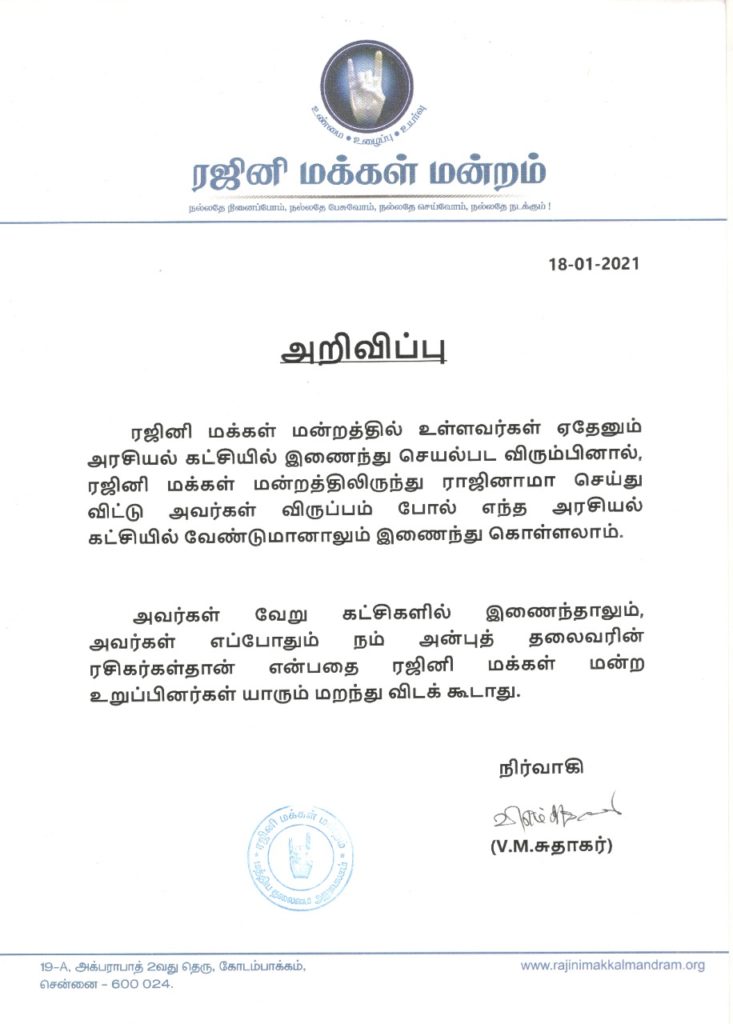 இந்தநிலையில் ரஜினி மக்கள் மன்ற நிர்வாகி சுதாகர் வெளியிட்டிருக்கும் அறிக்கையில், “ரஜினி மக்கள் மன்றத்தில் உள்ளவர்கள் ஏதேனும் அரசியல் கட்சியில் இணைந்து செயல்பட விரும்பினால், ரஜினி மக்கள் மன்றத்திலிருந்து ராஜினாமா செய்துவிட்டு அவர்கள் விருப்பம்போல் எந்த அரசியல் கட்சியில் வேண்டுமானாலும் இணைந்துகொள்ளலாம்.