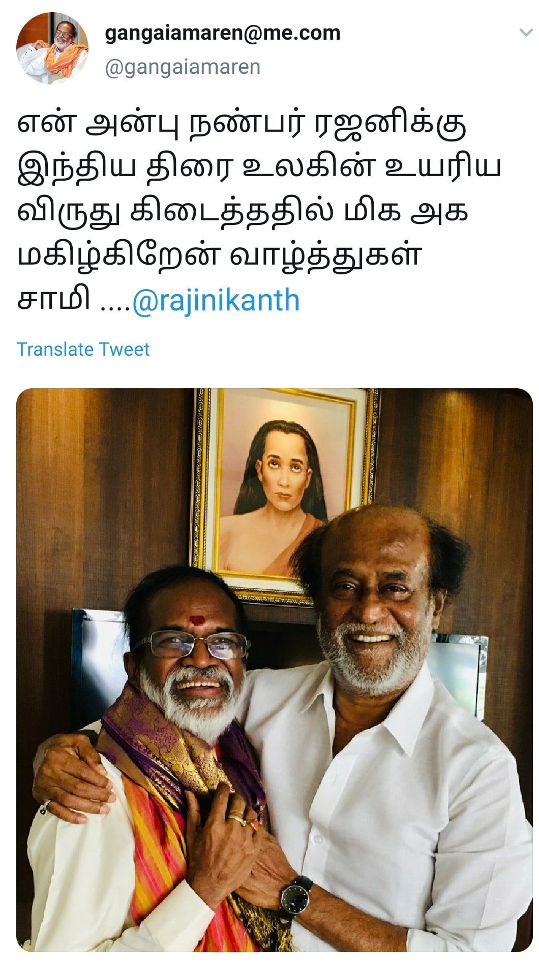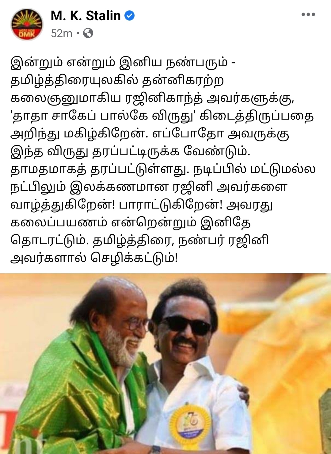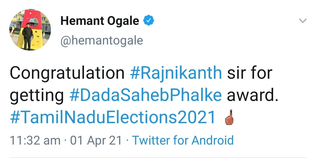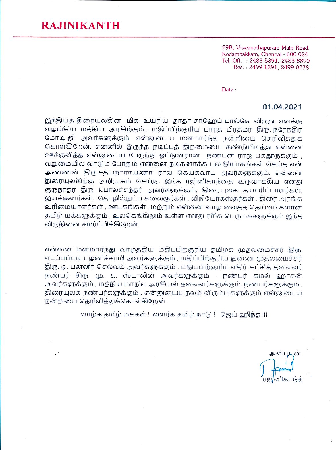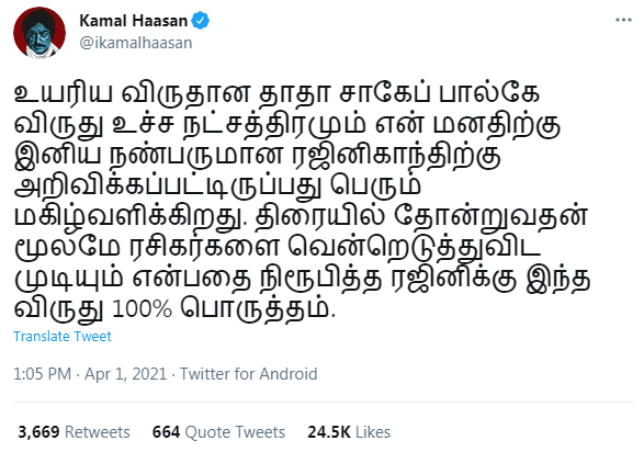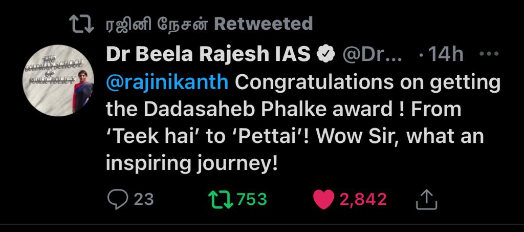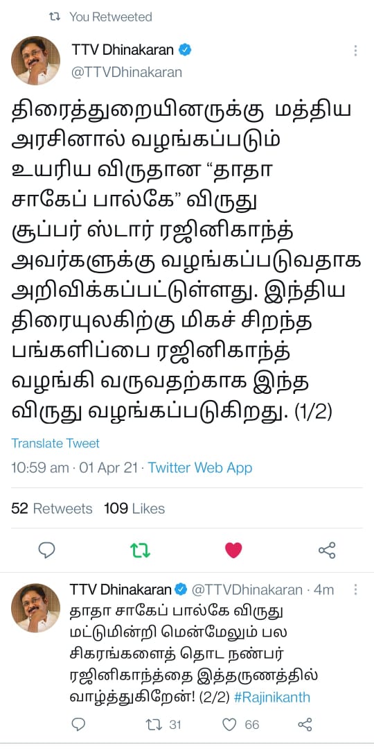 தமிழன் வளர்ந்தா தமிழ் தானா வளரும் என்று அவர் கூறியது போல, தானும் வளர்ந்து, ஜப்பானியரையும் தமிழ் கற்க வைத்த "தாதா சாஹேப் பால்கே" ரஜினிக்கு…… "தலைவர்" ரஜினிக்கு வாழ்த்துக்கள்….