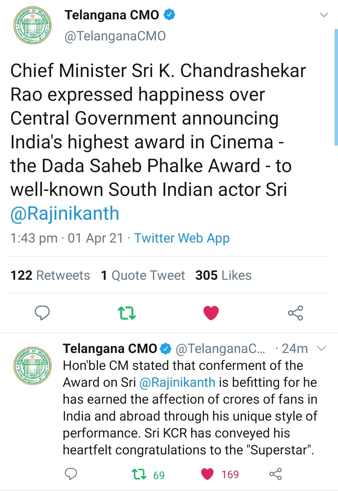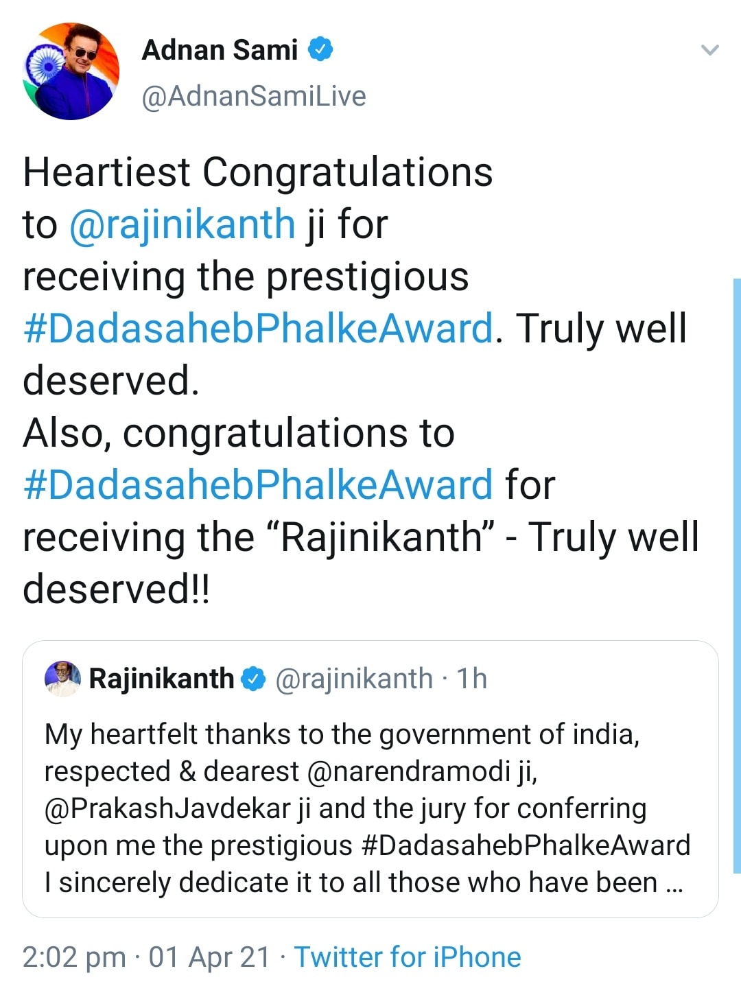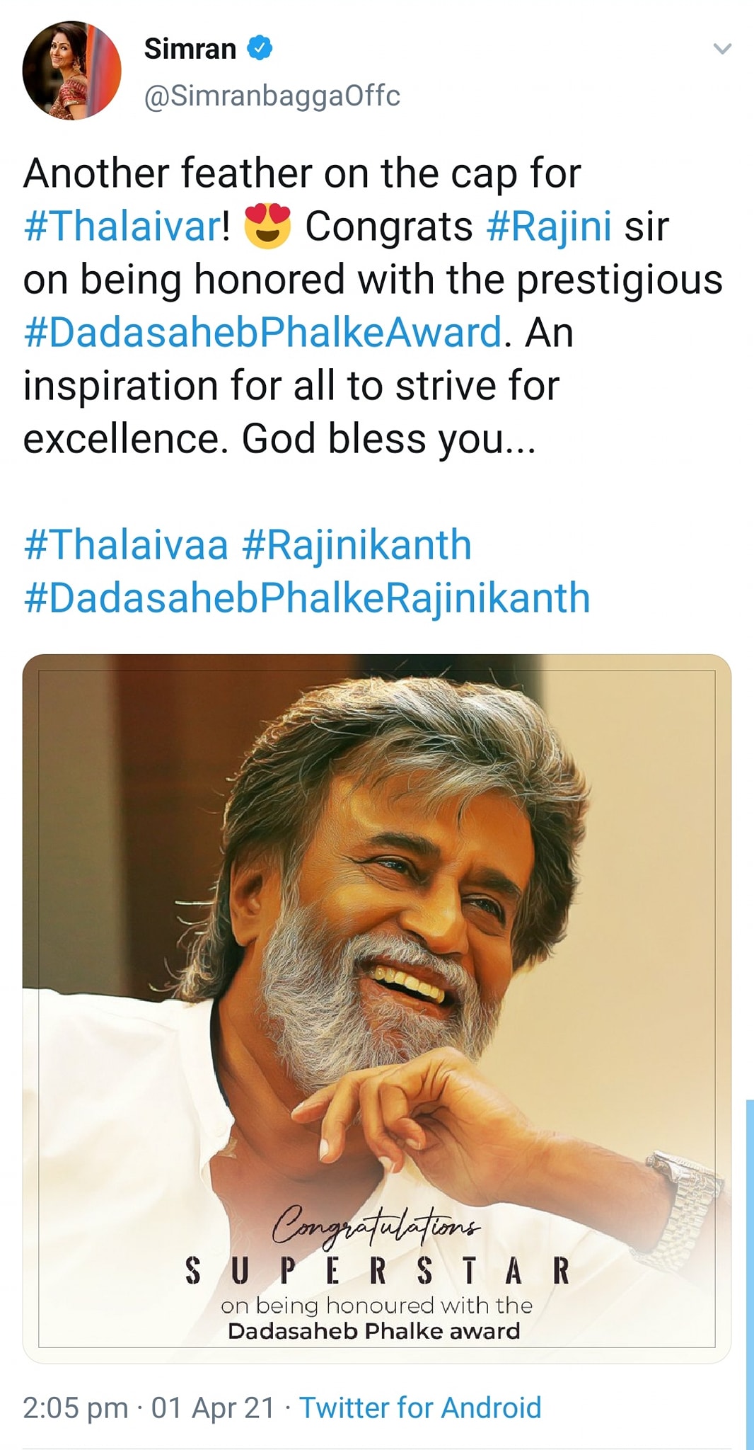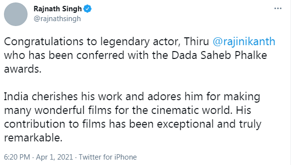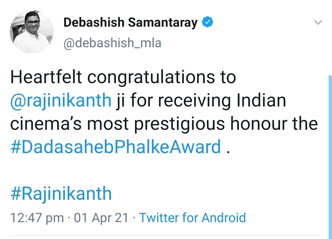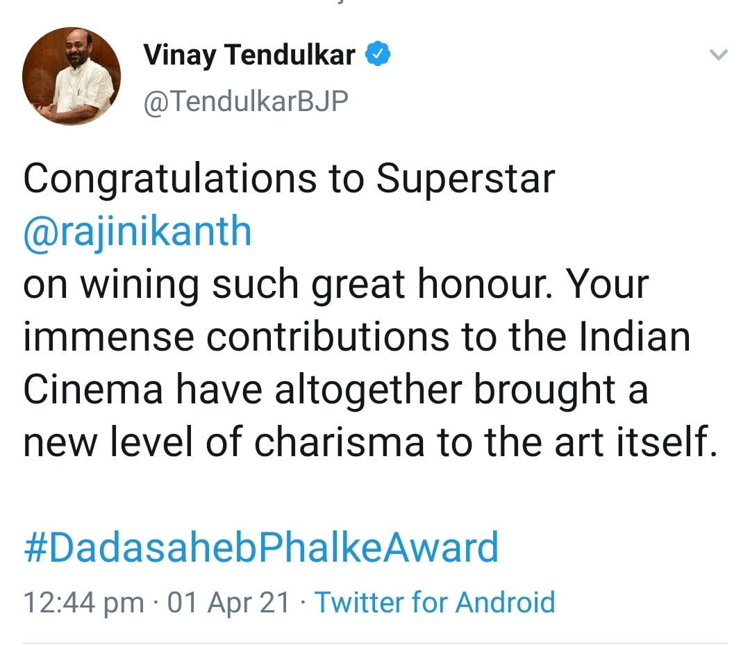 அதிலும் பிரதமர் நரேந்திர மோடி, மணிப்பூர் முதல்வர் பிரென் சிங், கர்நாடக முதல்வர் எடியூரப்பா ஆகியோர் ரஜினியை தலைவர் என்றே குறிப்பிட்டு வாழ்த்தியது பெரும் கவனத்தை ஈர்த்துள்ளது !!!