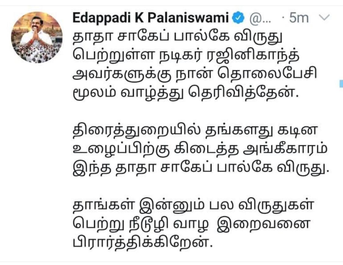 எடப்பாடி, ஓபிஎஸ் போன்ற ஆளும் கட்சி தலைவர்களும் வாழ்த்துகிறார்கள் !!! ஒரு பேட்டியின் போது ரஜினியை போல மிமிக்கிரி செய்து கிண்டல் செய்த TTV தினகரனும் வாழ்த்துகிறார் !!! ரஜினி இளைஞர்களை கெடுக்கிறார் என்று குற்றம் சாட்டிய பாமகவும் வாழ்த்தி இருக்கிறது !!!