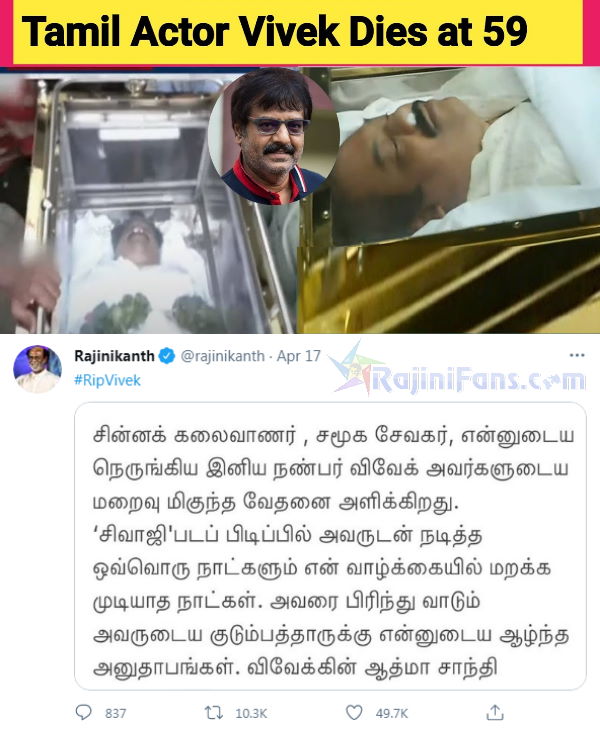 முன்னதாக விவேக் மருத்துவமனையில் இருந்தபோது, அவர் விரைவில் குணமடைய இறைவனிடம் பிரார்த்தனை செய்வதாக ரஜினிகாந்த் ட்வீட் செய்தார்.