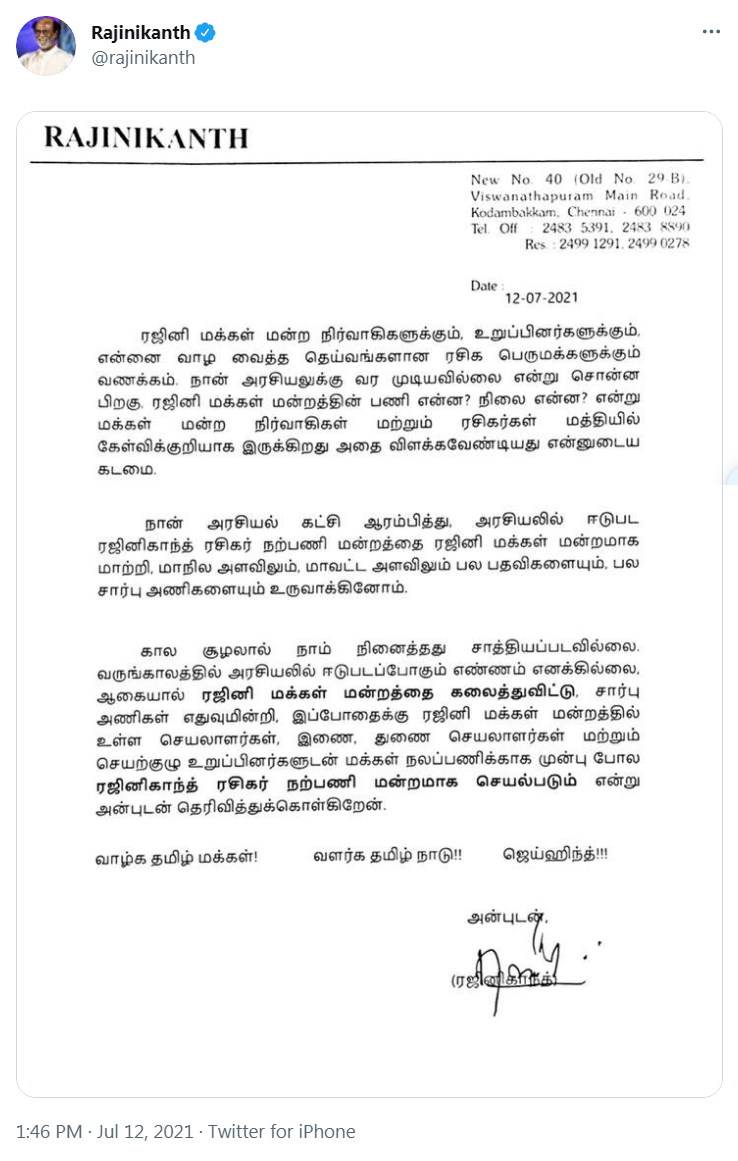 "கால சூழலால் நாம் நினைத்தது சாத்தியப்படவில்லை. வருங்காலத்தில் அரசியலில் ஈடுபடப்போகும் எண்ணம் எனக்கில்லை. ஆகையால், ரஜினி மக்கள் மன்றத்தை கலைத்து விட்டு, சார்பு அணிகள் எதுவுமின்றி, இப்போதைக்கு ரஜினி மக்கள் மன்றத்தில் உள்ள செயலாளர்கள், இணை, துணை செயலாளர்கள் மற்றும் செயற்குழு உறுப்பினர்களுடன் மக்கள் நலப்பணிக்காக, முன்பு போல ரஜினிகாந்த் ரசிகர் நற்பணி மன்றமாக செயல்படும் என்று அன்புடன் தெரிவித்துக் கொள்கிறேன்," என்று அறிக்கையில் குறிப்பிட்டுள்ளார்.