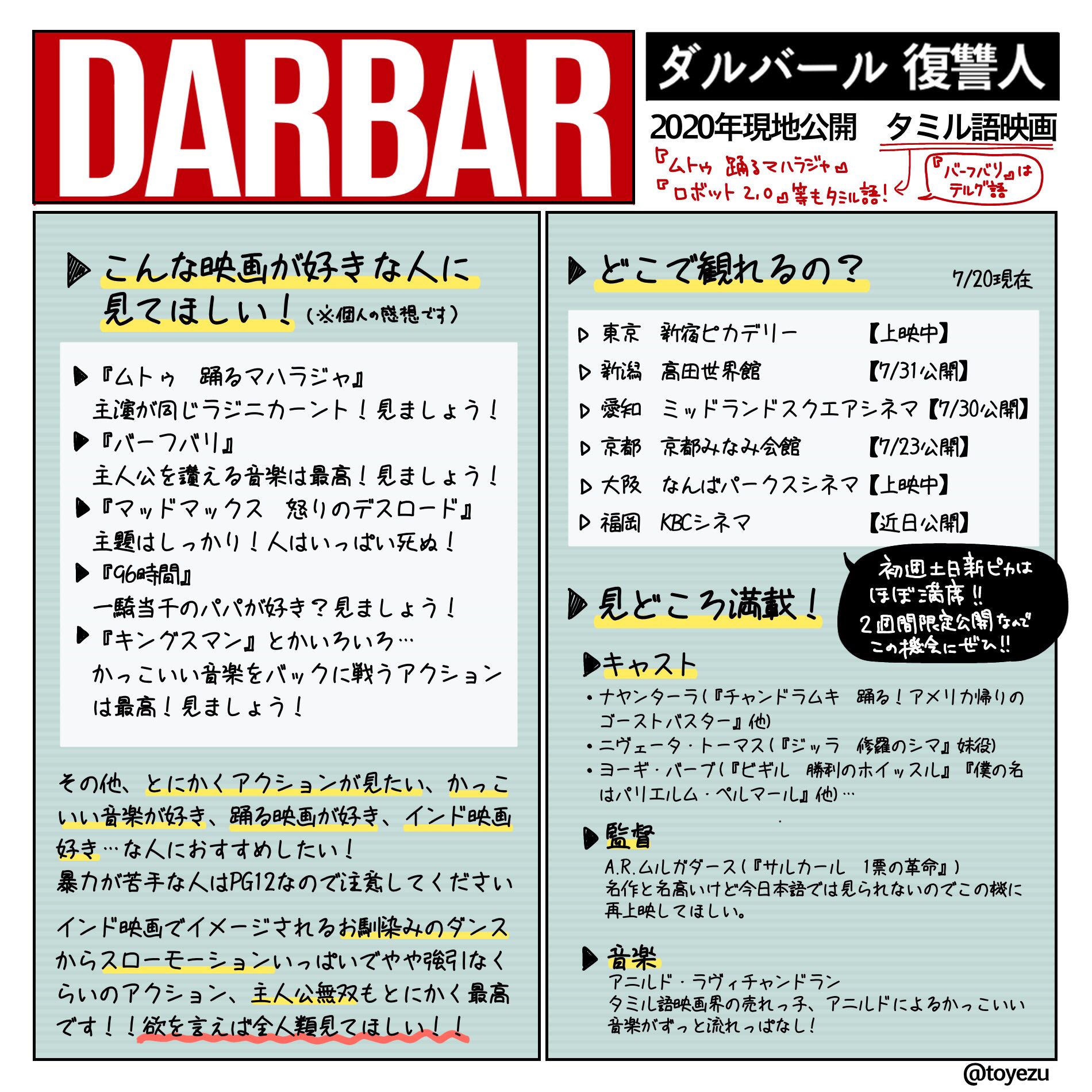 இந்த படத்தில் சூப்பர்ஸ்டார் ரஜினிகாந்த், நயன்தாரா, நிவேதா தாமஸ், யோகி பாபு போன்றோர் நடித்துள்ளனர், சூப்பர் ஸ்டார் ரஜினிகாந்த் அவர்கள் போலீஸ் கமிஷ்னர் ஆக கலக்கி உள்ளார் என்பது குறிப்பிடத்தக்கது...படத்தின் பின்னணி இசையால் ரசிகர்களை உற்சாகப்படுத்தி இருப்பார் அனிரூத் அவர்கள்...தர்பார் திரைப்படம் இந்தியாவில் வசூலை குவித்தது போல் ஜப்பானில் வசூலில் வெற்றிபெறும் என்று தயாரிப்பாளர் தரப்பில் கூறப்பட்டுள்ளது.