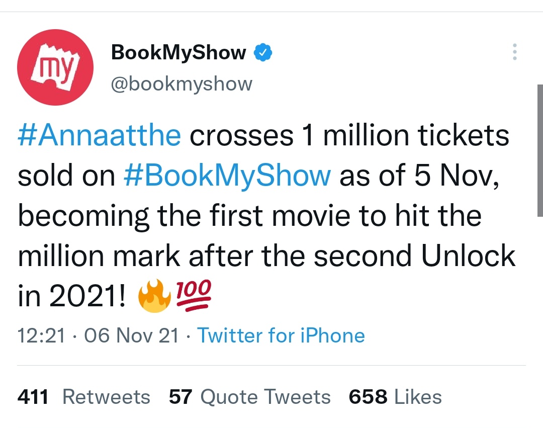 Online platform BookMyShow on Saturday tweeted that it had sold a whopping one million tickets for Annaatthe by November 5. It added that Annaatthe is the first movie to cross the one-million mark on the platform after the second lockdown was lifted. Qube Cinema, in a tweet, said that Annaatthe had collected $1.5 million across all first day, first shows overseas, excluding the UK and Europe.