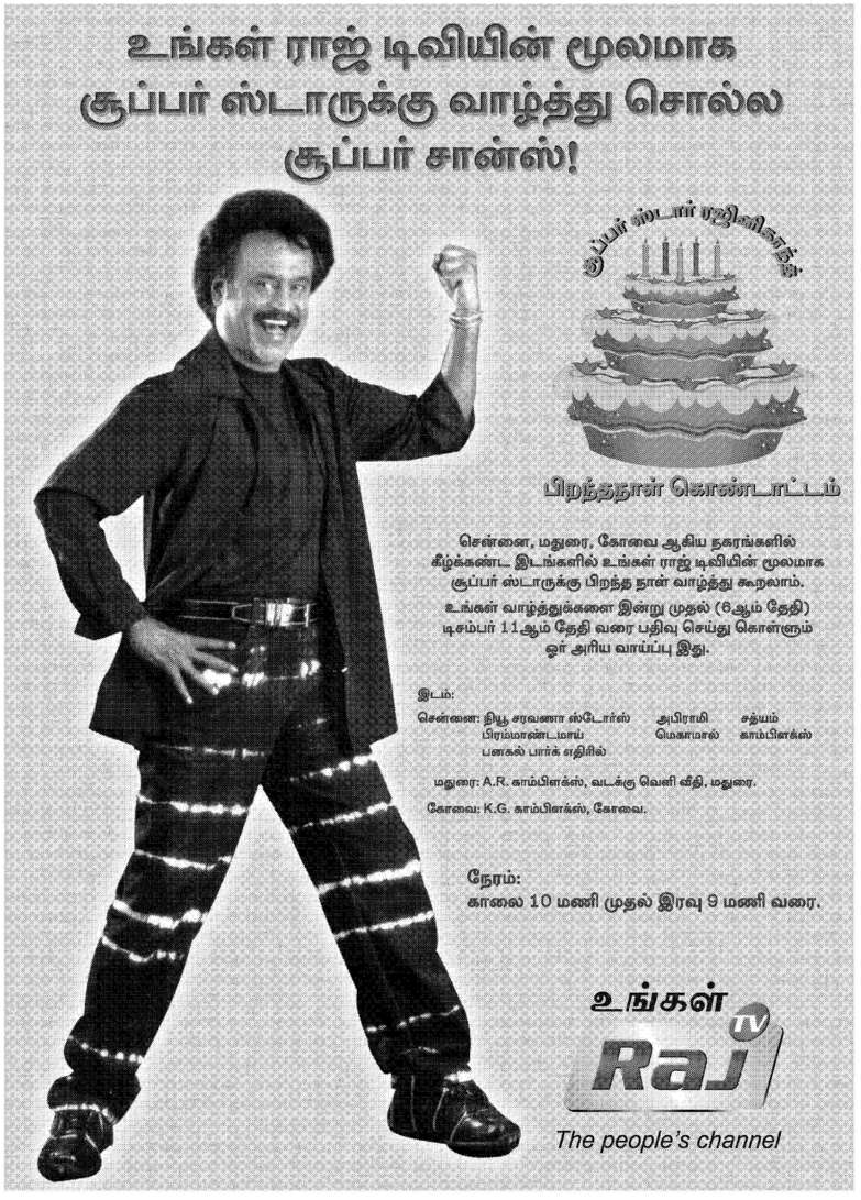 Chennai, Kovai & Madurai fans can wish our superstar for his birthday through Raj TV